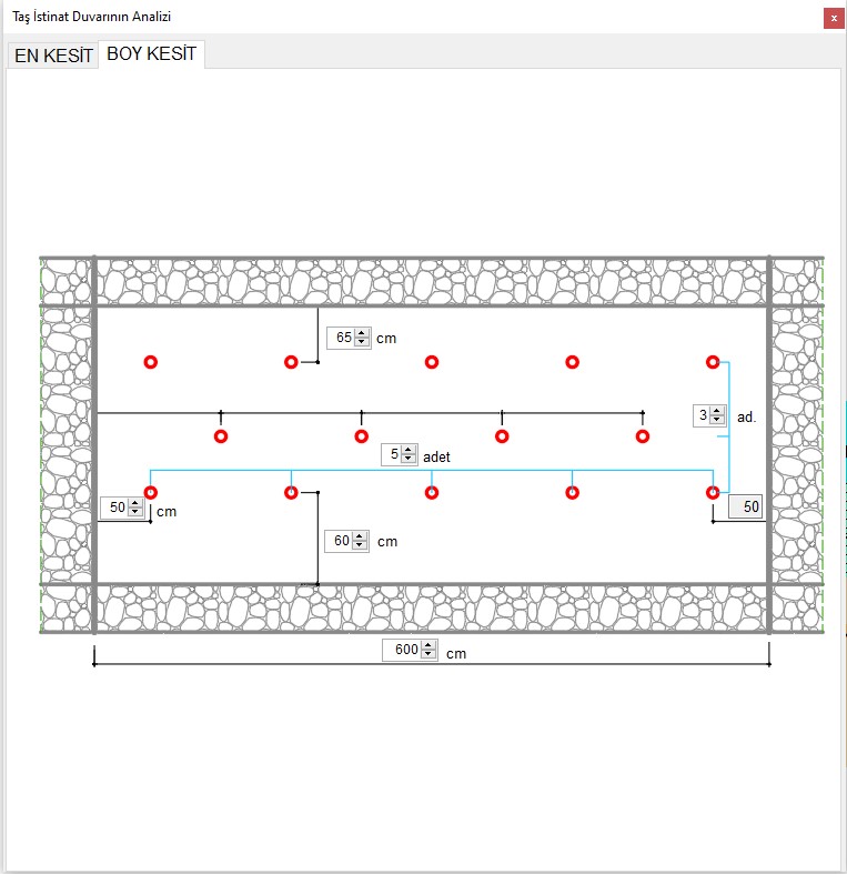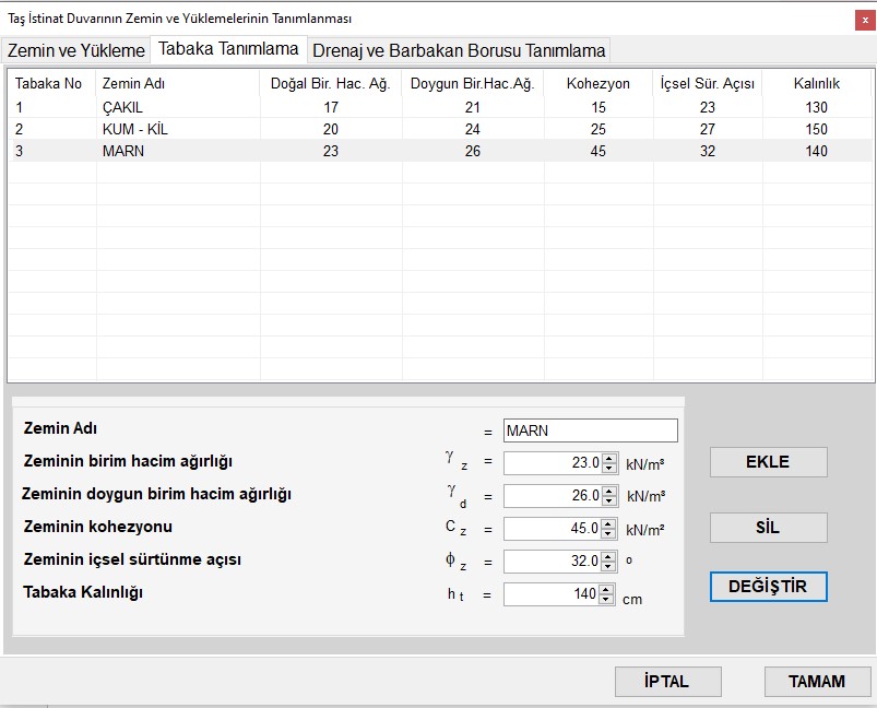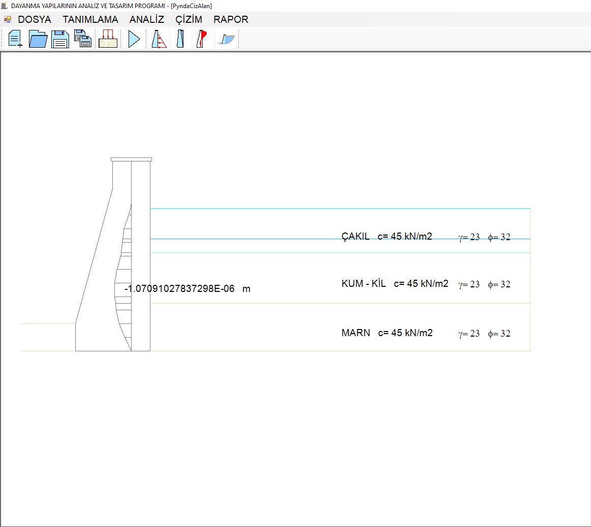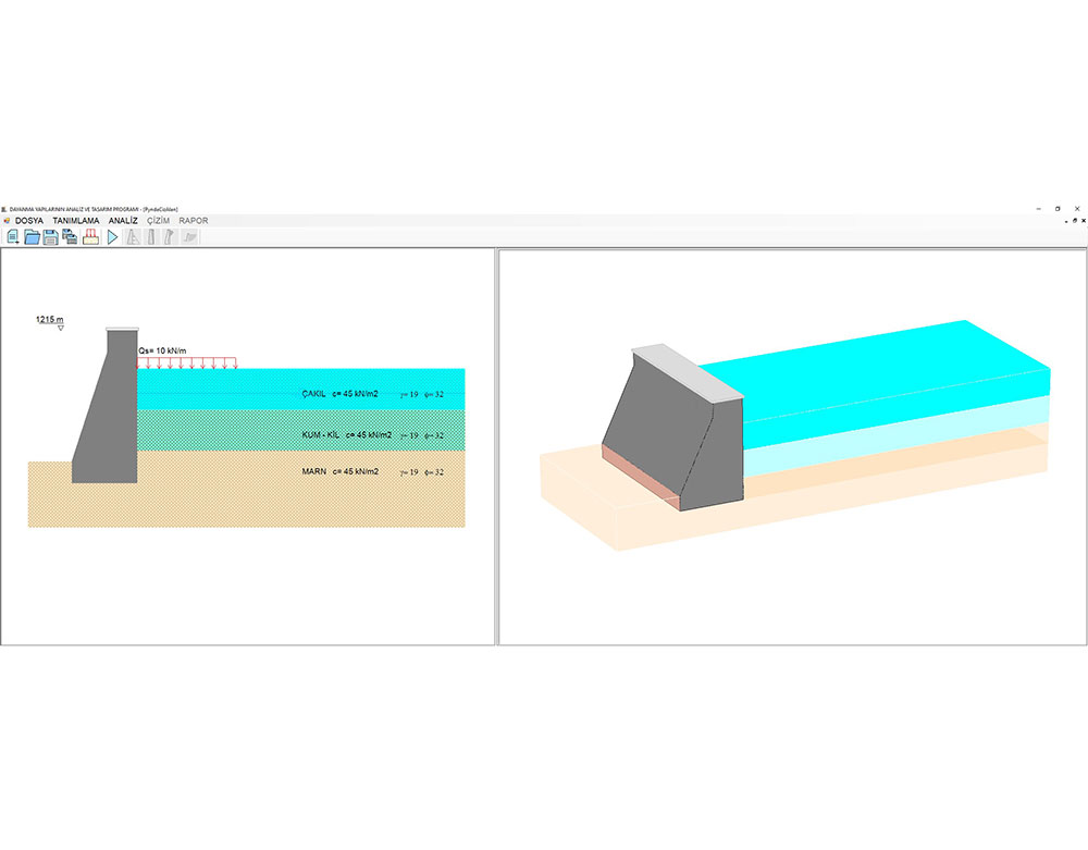 İstinat duvarı altındaki gerilme, zeminin taşıma gücü ile karşılaştırılmaktadır.İstinat duvarının geometrisi değiştirilerek hesaplar anlık kontrol edilmektedir.